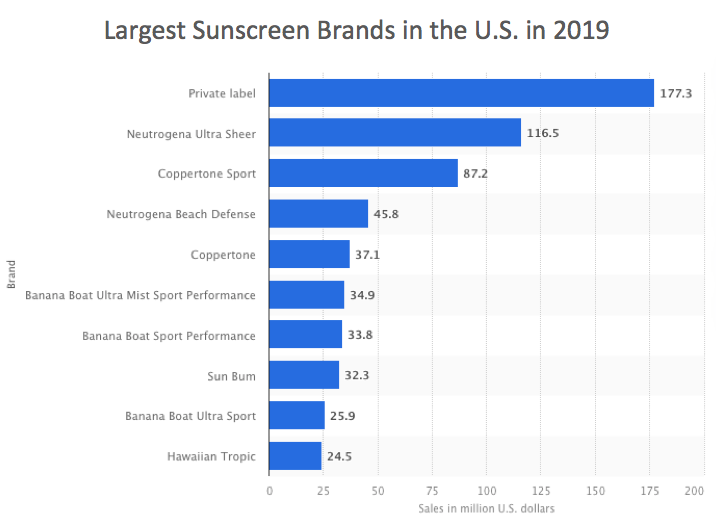 Sunscreens and sun tan oils started becoming more widespread in the 1970s and 80s, and skin cancer rates have been steadily increasing since then as well. As mentioned above, us asking whether sunscreens have helped reduce skin cancer rates is similar to asking if Neutrogena, Coppertone and the Banana Boat sunscreens have helped reduce skin cancer rates. This is because these 3 brands dominate market share in the U.S. and the globe. For some visual, below is a chart that show sales in the U.S. in 2019 of the leading sunscreen brands.