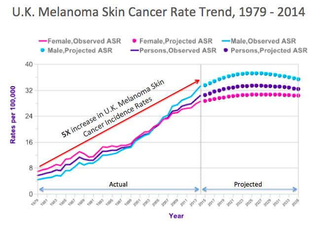 Our second chart below, which is equally illuminating, is the ‘U.K. Age-Standardized Melanoma Skin Cancer Incidence Rates.’ This chart gives actual data from 1979 - 2014, then provides projections till 2035. I am focusing on the actual historical data here. We see that the increase in U.K.’s skin cancer rates has been even higher. The overall incidence rate went from about 6 cases per 100,000 in 1979 to 30 cases per 100,000 in 2014 (3). That’s an increase of 5X or 400% from 1979 - 2014 in U.K.’s melanoma skin cancer cases! That’s an obnoxious rise especially considering the booming chemical sunscreen sales during the period and the increased awareness around using such sunscreens.